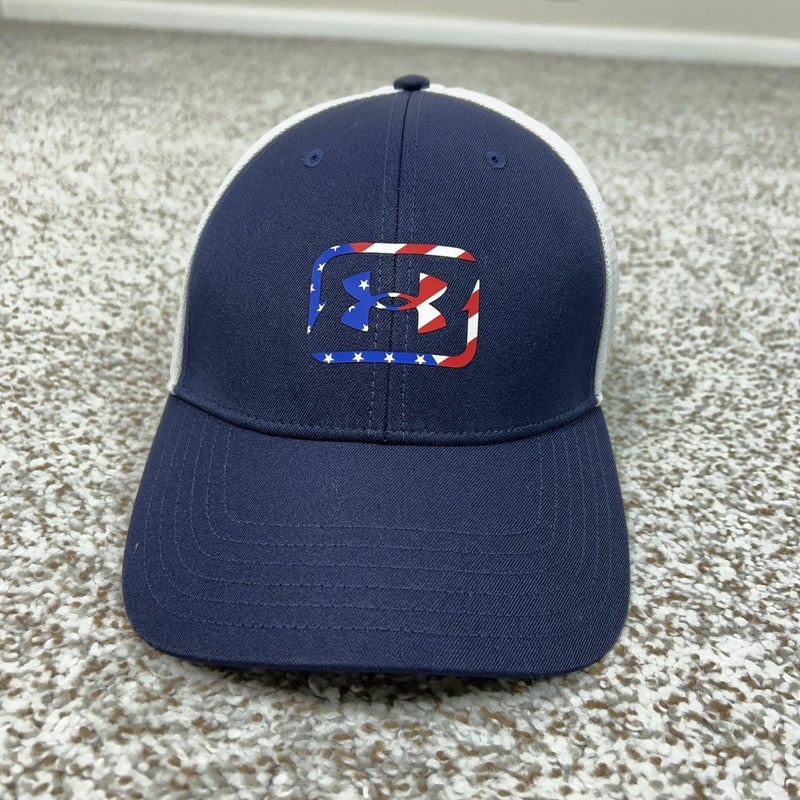 Under Armour Fish Hat Cap Flex Mens One Size Blue White USA Flag Mesh Patriotic