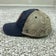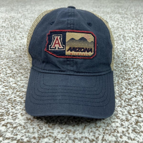 Pre-owned hat with moderate overall wear from previous use. Navy cotton front panels and brim show some fading, discoloration, lint, and wrinkling, but fabric remains intact with no holes or tears. Tan mesh back panels, embroidered Arizona Wildcats patch, Z logo, eyelets, snap back closure, and interior taping are solid and functional; sweatband and interior front label show noticeable darkening, fraying, and wear from normal use.