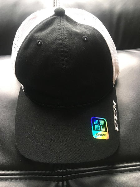 Black CCM one size fits all hat. Mesh rear panels for maximum breathability. Velcro sizing adjustment. New condition.