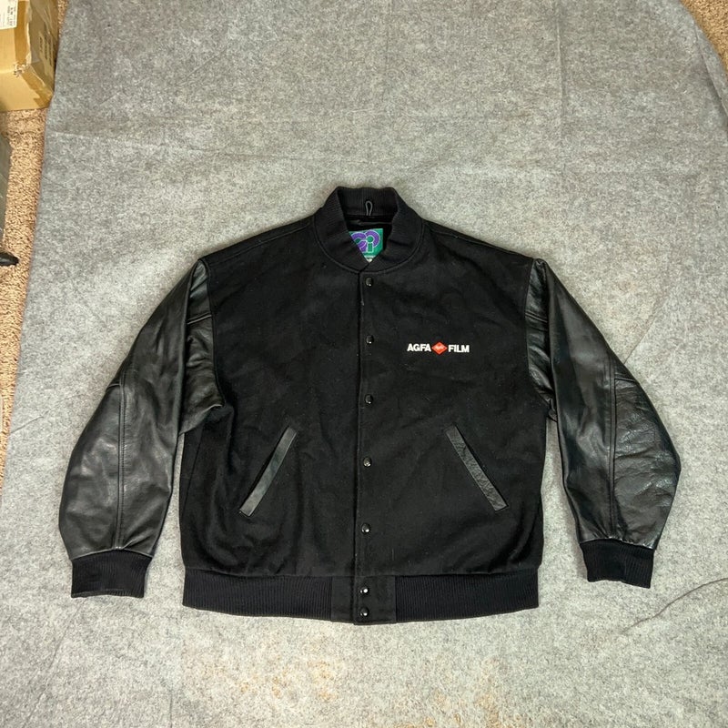 Vintage Mens Jacket Large Black AGFA Film Wool Leather Bomber Varsity Corporate