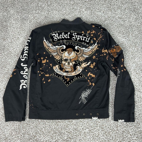 Graphics and accents: Large back embroidered and appliqué design featuring Rebel Spirit script, a winged skull with snake motif, and Rebel For Life banner, plus additional embroidered skull patch on one sleeve, contrast stitched graffiti-style signature motifs near the cuffs and back, and textured metal crest zipper pull.