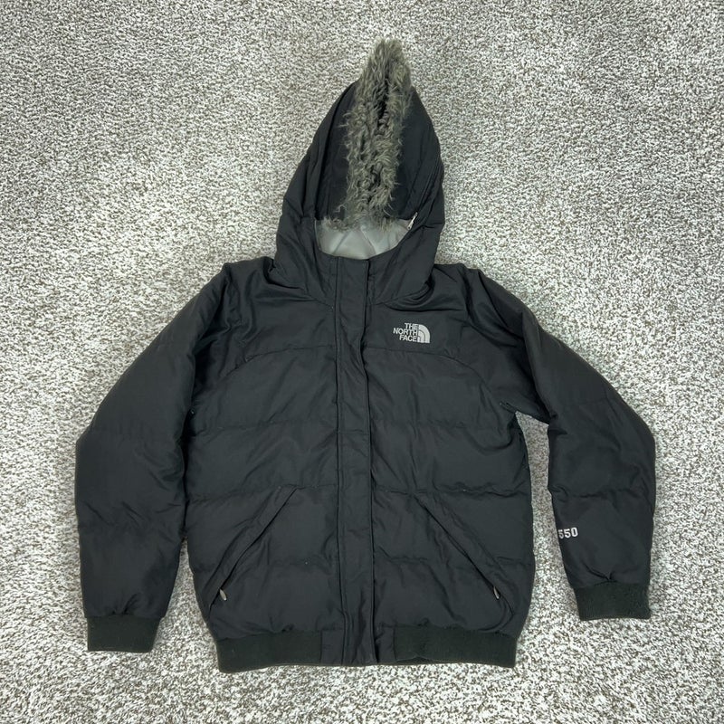 Pre-owned The North Face girls 550 down puffer jacket with light general wear and minor surface lint from previous use and laundering. Shell fabric, faux fur trim, lining, zipper, pockets, cuffs, and hem are clean, intact, and fully functional with no holes, stains, or tears. Down insulation remains lofted and warm throughout.