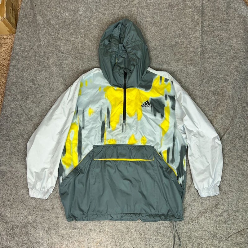Adidas Mens Jacket Large Gray Yellow Windbreaker Hooded Anorak Windbreaker Sport