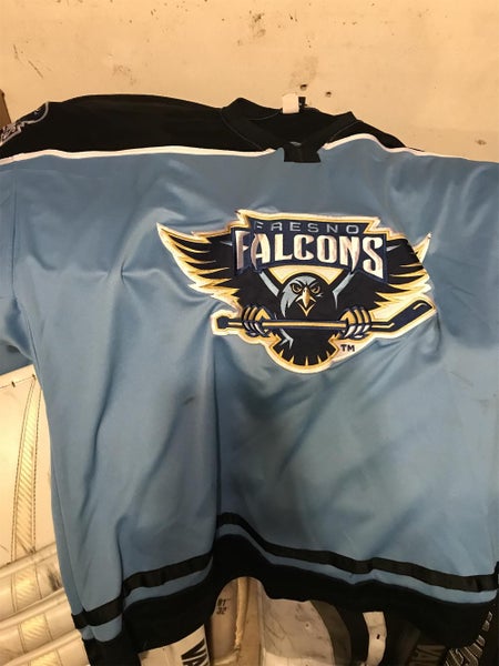 Fresno Falcons goalie cut jersey. Size is 58G but fits like a 60G. Has authentic patches on front and the shoulders. Has a fight strap. In great shape.