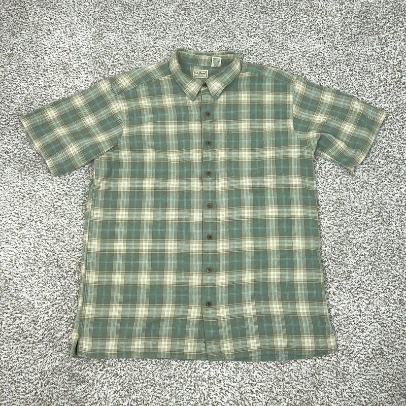 Vintage LL Bean Shirt Mens Large Tall Green Plaid Short Sleeve Button Cotton