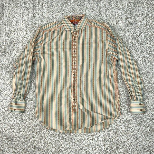 Robert Graham Shirt Mens Large Beige Flip Cuff Embroidered Button Striped Work