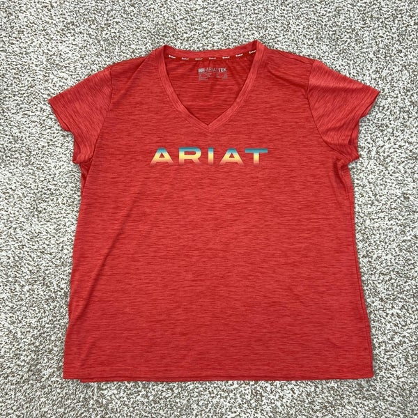 Color: Red heather with multicolor gradient ARIAT logo across the chest and small AriatTEK logo at the back hem.