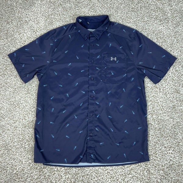 Under Armour Shirt Mens XL Blue Fly Fishing Print Button Vented Pocket Outdoor