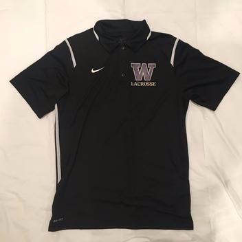 Travel polo for the club team at University of Washington. Black Nike Dri-fit with the purple and gold logo printed on the front. Not rips or stains.