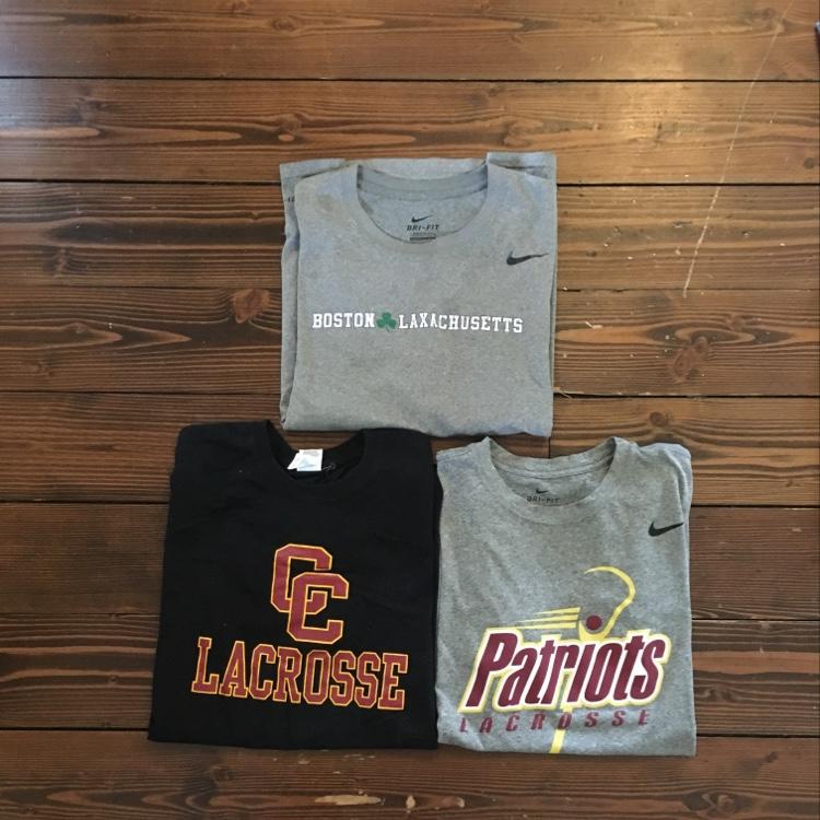 2 Used Nike tees and one CC lacrosse Tee. The Laxachusetts tee has a rip so it is $5. The others are both $10 and are in good condition.