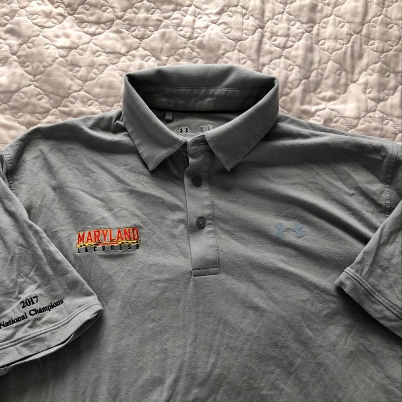 Maryland 2017 National Champ UA Polo. Gray. Maryland lacrosse on right breast and 2017 National Champs on right sleeve.