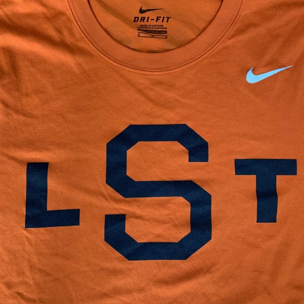 Men’s medium Nike Dri-Fit tee shirt. The LST logo was on the 1916 Syracuse lacrosse team’s jerseys. The Syracuse 100 year anniversary logo is on the back of the tee shirt