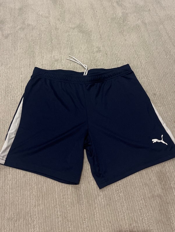 Puma navy blue soccer shorts. White side accent panel.