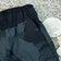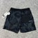 Features elastic waistband with drawstring, all-over abstract black/charcoal print, and a secure zip back pocket