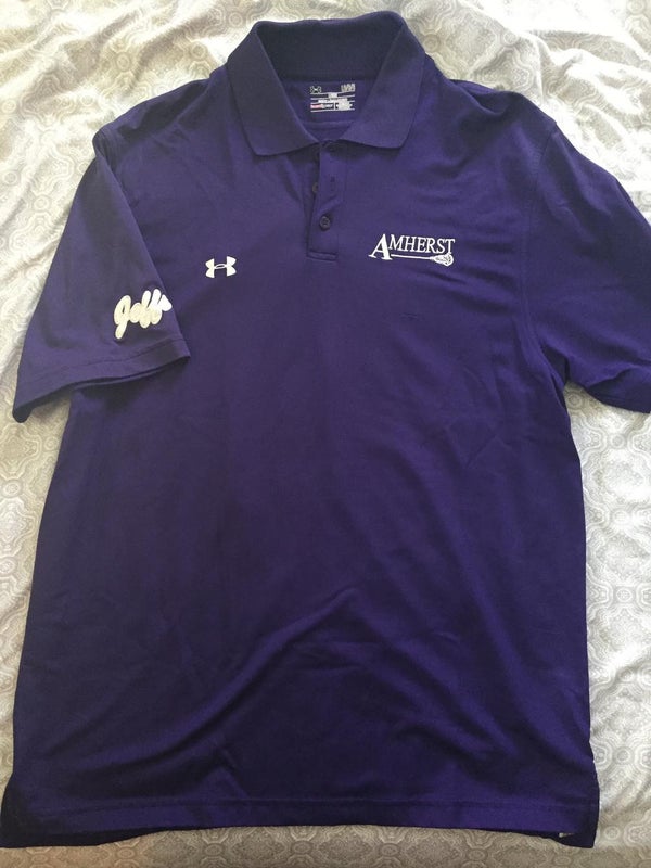 Team-issued Amherst College Golf Polo. This piece is lightly worn, size L, UA heat gear material. Customized chest logo and cursive 'jeffs' on the sleeve.