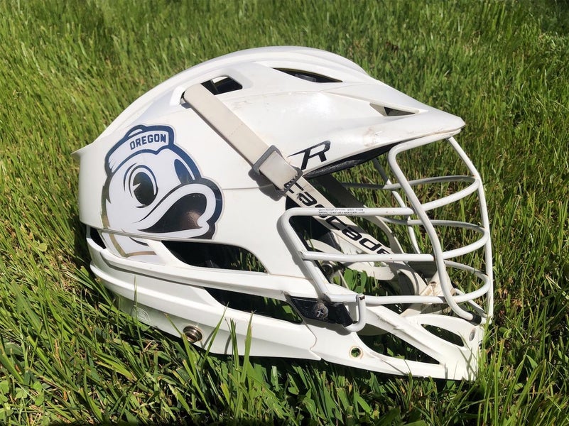 Team issued and game worn Oregon lacrosse helmet. Slightly used but in great condition, only a few ball burns on one part of the helmet. Comes with chin strap but ear no pads (large pads are installed).