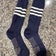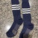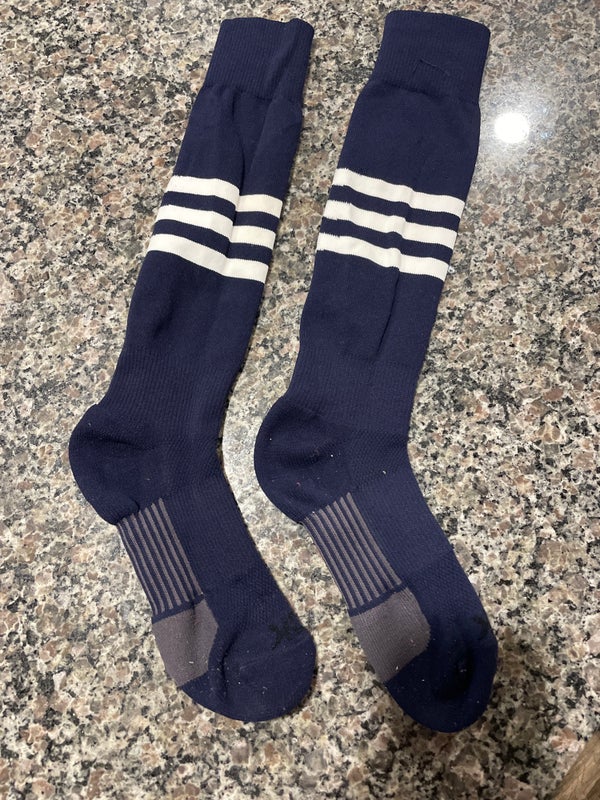 These are used TCK Dugout striped baseball socks designed for youth unisex players. They come in a medium size and feature a blue color with a classic striped pattern known as Pattern B. The socks are long and knee-high, suitable for baseball use. As a single pair, they have been worn previously and show typical signs of use consistent with their condition. These socks are intended for young athletes looking for reliable, used baseball gear.