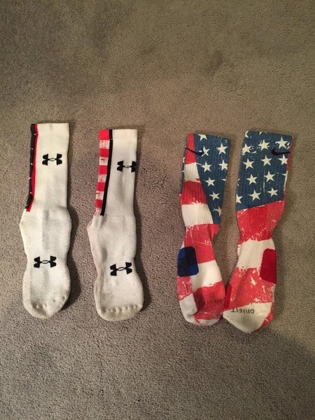 Worn a few times, UA: size large (fits men's 9-12, I believe) , Nike: custom elites, size large (fits men's 9-12, I believe), both socks fit me (size 11.5-12) just fine, no trades and open to all offers