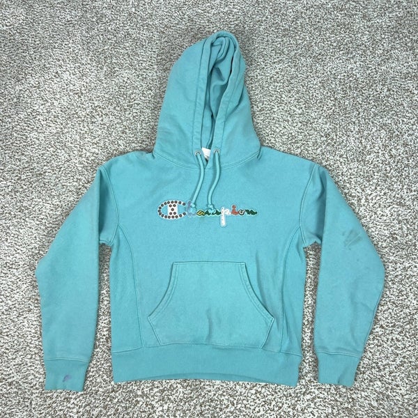 Champion Hoodie Womens Small Blue Reverse Weave Pullover Fleece Floral Logo