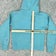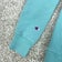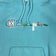 Color: Solid teal blue body with multicolor floral applique Champion script across the chest and a small C logo at the left cuff.