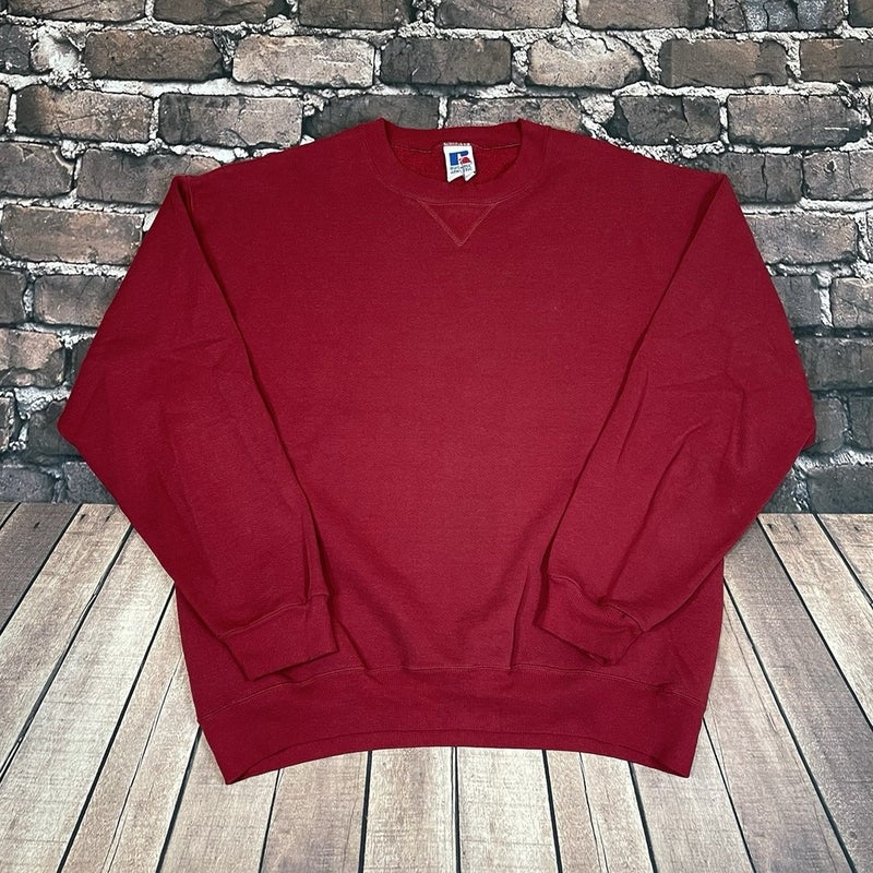 Pattern: Solid Sleeve Length: Long Sleeve Closure: Pullover Neckline: Crew Neck Size: XL Garment Care: Machine Washable Color: Red Material: ["Cotton", "Polyester", "Cotton Blend"] Fabric Type: Fleece Accents: ["Logo", "Embroidered"] Vintage: Yes Brand: Russell Athletic Size Type: Regular Type: Sweatshirt Department: Men Style: Pullover Theme: ["90s", "Biker", "City", "Classic", "College", "Colorful", "Dad", "Outdoor", "Retro", "USA"] Features: ["All Seasons", "Heavyweight"] Season: ["Fall", "Winter", "Spring"] Country of Origin: United States Performance/Activity: ["Golf", "Gym & Training", "Hiking", "Tennis", "Walking"]