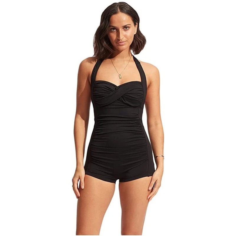 Seafolly Collective Boyleg Swimsuits Women's 8 Black Ruched One Piece GBO2194