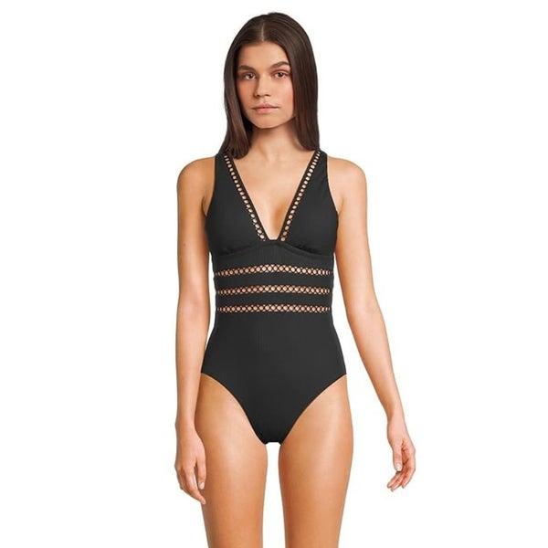 Becca Modern Edge Rib Toni Swimsuits Womens Medium Black Plunge One-Piece JZZ722