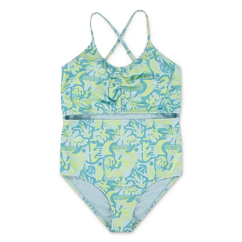 Hurley Cutout Swimsuit Girls 14 Turquoise Printed Criss Cross One Piece DDR2110