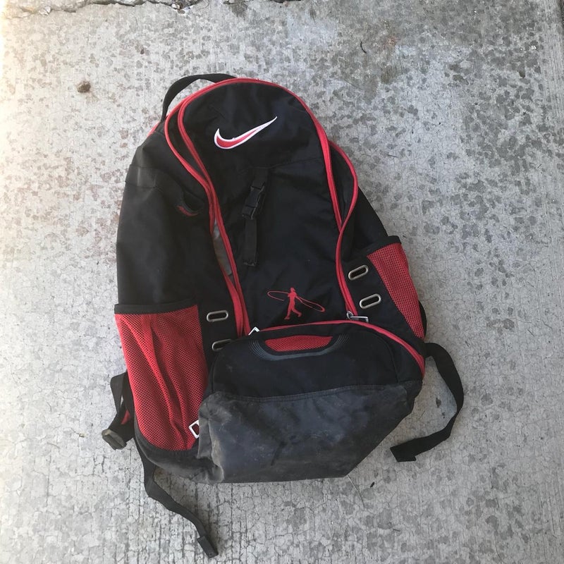 Slightly used Nike baseball bag. 2 straps on the back. A pouch for your cleats at the bottom. A compartment at the top for batting gloves. There is a hook inside to hang on the cage.