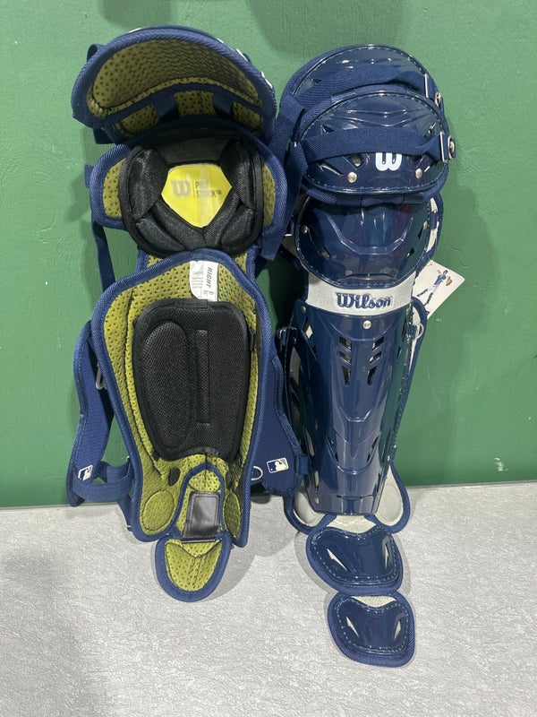 The Wilson Pro Catcher's Leg Guards are designed for adult catchers seeking reliable lower leg protection without sacrificing mobility. These guards feature a 14.5" size, which offers comprehensive coverage from the knee down, helping to absorb impacts from foul tips and collisions behind the plate. The construction balances durability and comfort, allowing for extended wear during games and practices. This pair is new, so it hasn’t been broken in yet.