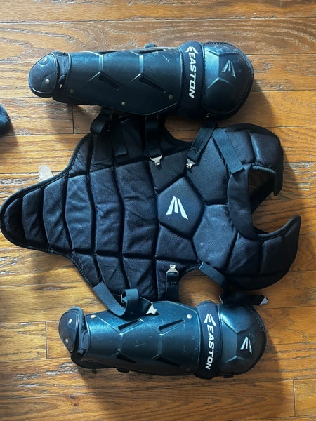 Easton catcher chest protector and shin guards. All black color. Good for baseball or softball. Gear is solid, ready for the season