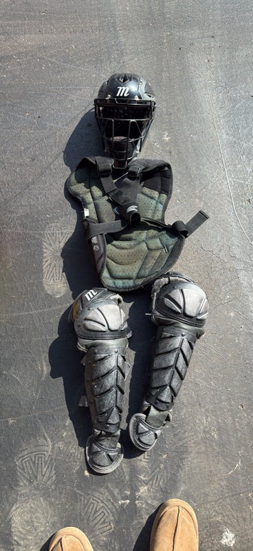 This is a used Marucci catcher’s set in black, suitable for youth players. It has been used for about one and a half seasons. Naturally, there are some scratches and signs of wear on the equipment, which is typical for catcher’s gear, but overall the set remains in good condition. The set includes all the necessary pieces for a young player, though specific model details are not listed. This is a single set being sold as is.