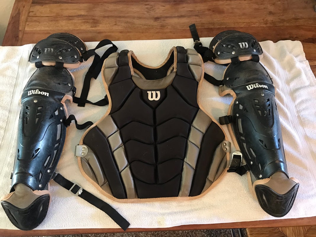 Used black and gray Wilson catchers gear 15 1/2 inch legs large chest protector