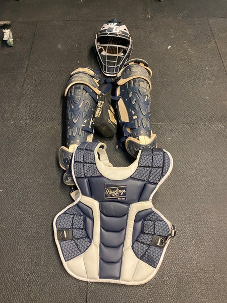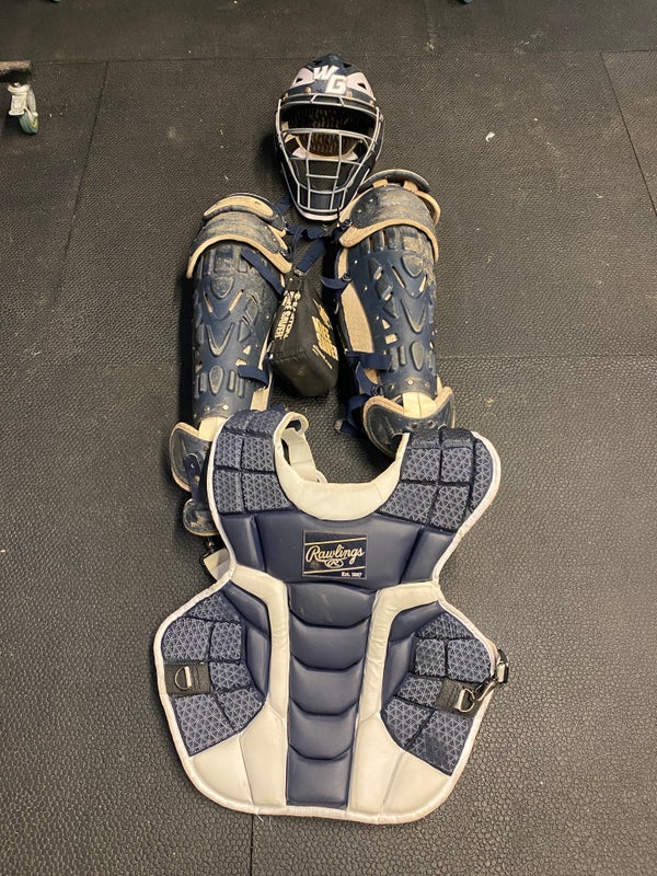 This set of catcher gear has been used for 2 seasons at the high school level. The chest protector is in great condition, and the helmet and leg pads are in ok condition. Lots of life left in this gear. The helmet is sized 7 1/8 - 7 3/4.