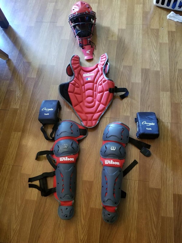 Lightly used one season. Some scuff marks on the knees, but otherwise in perfect condition. Also includes an Easton neck protector Knee savers.