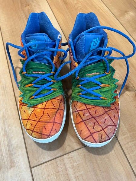The Nike Kyrie 5 is a basketball shoe designed to provide agile players with responsive traction and support. Known for its curved outsole, the shoe allows quick cuts and enhanced court feel, while the Zoom Air cushioning offers a low-profile yet effective impact protection. This version features an orange SpongeBob-themed colorway, adding a playful look without compromising performance. The shoe is used and sized at 6Y, suitable for youth players.