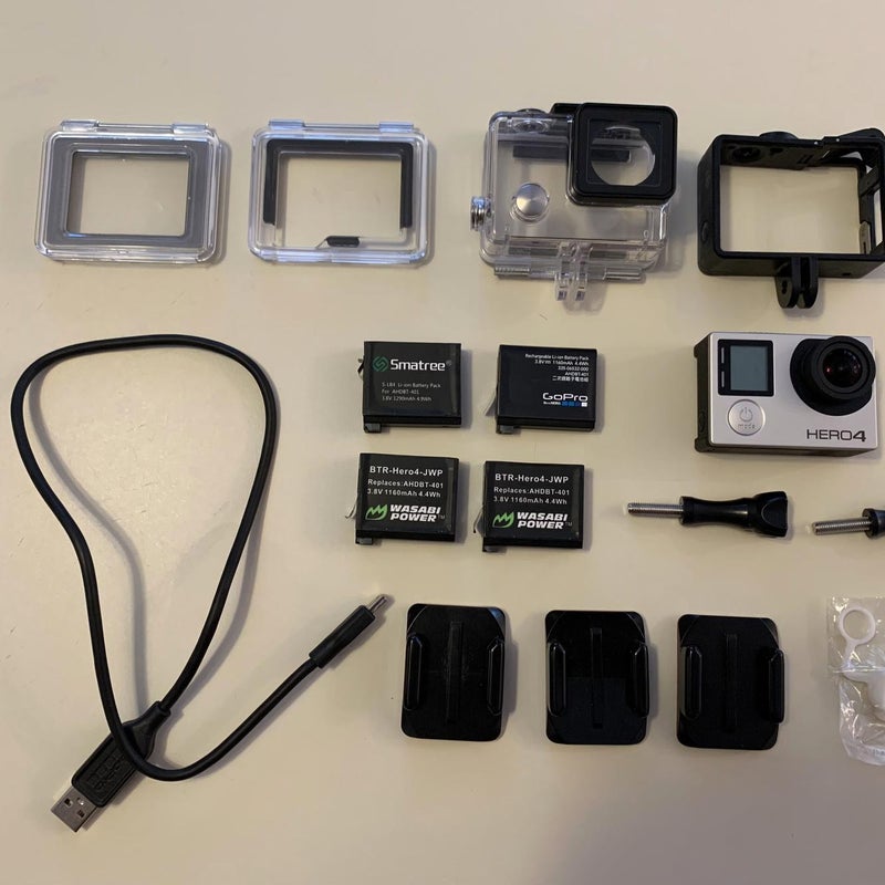 This listing includes a GoPro Hero 4, waterproof housing with extra doors, skeleton housing, four batteries, charging cable, multiple mounts.