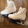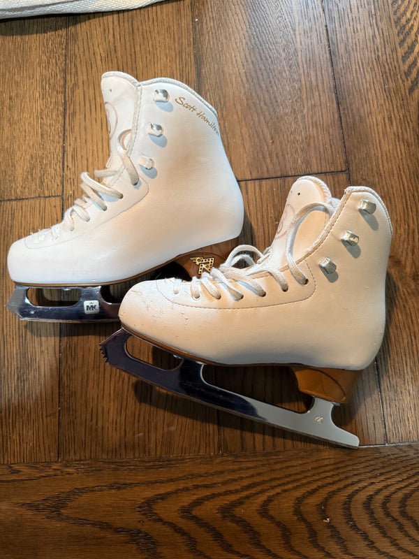 These figure skates Scott Hamilton MK Blades have been used for about a year and remain in good condition. They are white in color and have a standard B width, suitable for average foot sizes. Please note that these skates do not come with insoles. The size 20.5. Overall, they are a functional pair of used skates without any additional accessories.