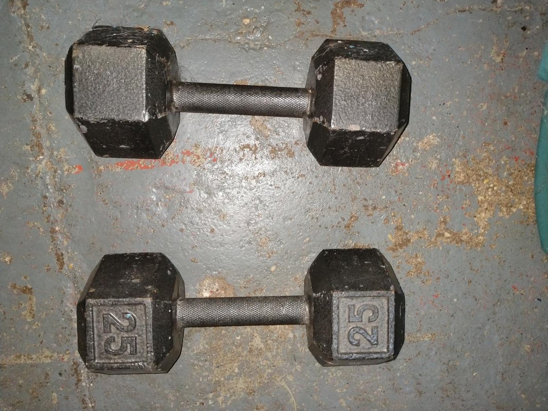 CAP Barbell Cast Iron Hex Dumbbell set of 2 pcs. 25 LBS each. Used but still in good shape. See pictures for condition. Will sell separately if you just want one. Message me with any questions. Make offer