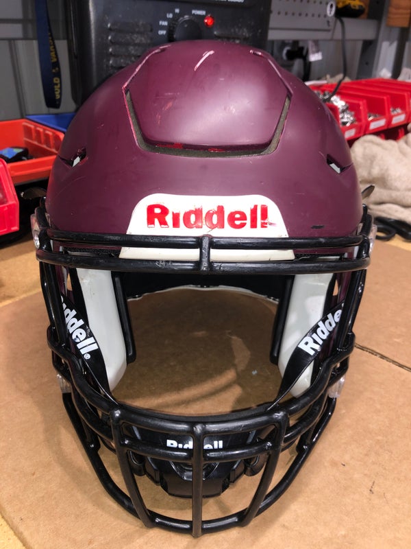 Used Riddell Speed Flex Flat Maroon Adult Large football helmet with a Black mask. Initial season is 2020. Helmet was last reconditioned in 2025 and has been used since then. Come's with a chin strap. Liners Hold air except jaw pads. We can switch out the mask to another style or color if available. Please ask before buying. We can’t guarantee the helmet will fit. Use the sizing chart we provided to determine your head size.
