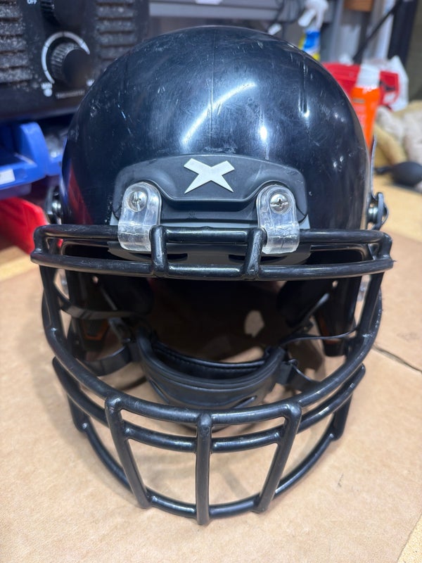 Used X2E+ Youth Medium Black Football Helmet with a Black mask. Initial Season is 2021, was last reconditioned 2024 and has been used since then. Padding is in good shape.