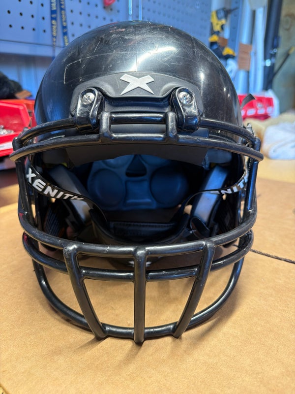 Used X2E+ Youth Medium Black Football Helmet with a Black mask. Initial Season is 2019, was last reconditioned 2024 and has been used since then. Padding is in good shape.
