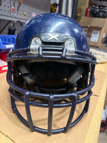 Used X2E+ Youth Medium Navy Football Helmet with a Navy mask. Initial Season is 2022. Was reconditioned in 2024 and has been used since then. Padding is in good shape.