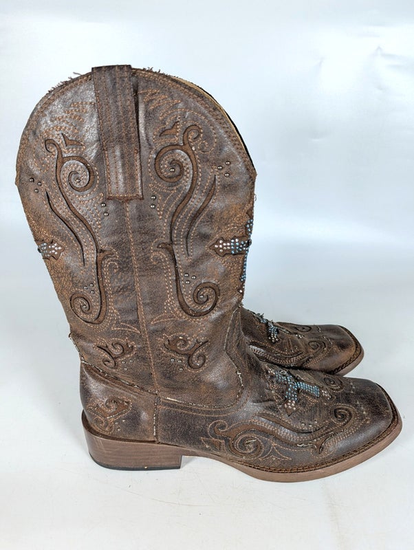 ROPER Cross Faith Rhinestone Square Toe Boots #09-021-1901-0937 Women's Size 9