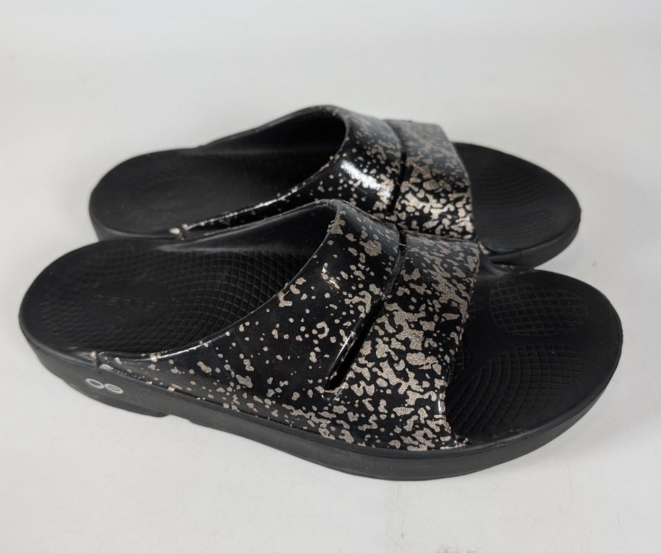 OOFOS OOahh Lux Slide Recovery Sandals Black Gold Women's Size: 9