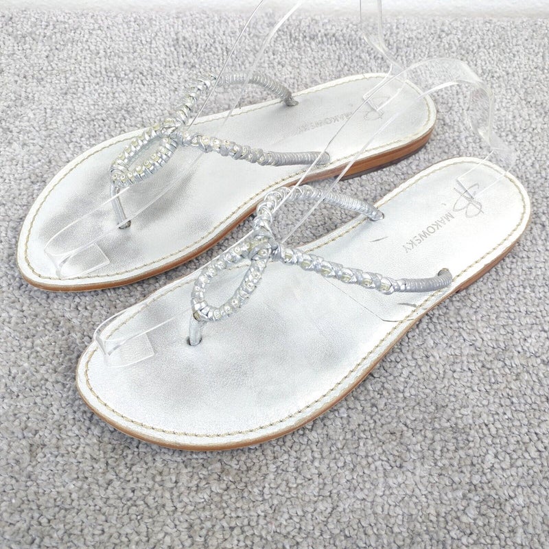 B Makowsky Sandals Womens Size 10 Shoes Thong Slip On Braided Beaded Silver