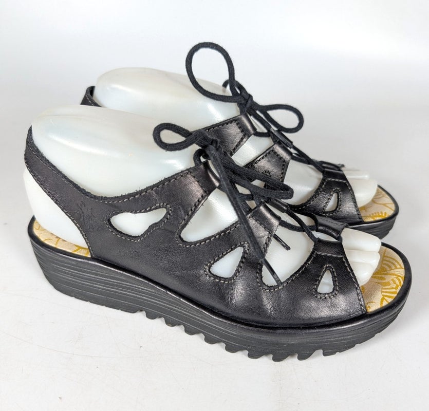 Fly London Yifa Black Leather Wedge Sandals Lace Up Slingback Women Size 38 / 7