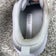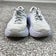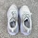 Pre-owned with light dirt and discoloration on white mesh uppers, including a small yellowish mark near one lace area and darkening around toes and eyelets. Midsoles show small scuffs and smudges along the sidewalls, and heel collars have light staining on the outer panels and inner lining. Outsoles have dirt buildup with mild to moderate wear to rubber tread; structure, cushioning, laces, and uppers remain intact with no rips, tears, or separation, insoles present.