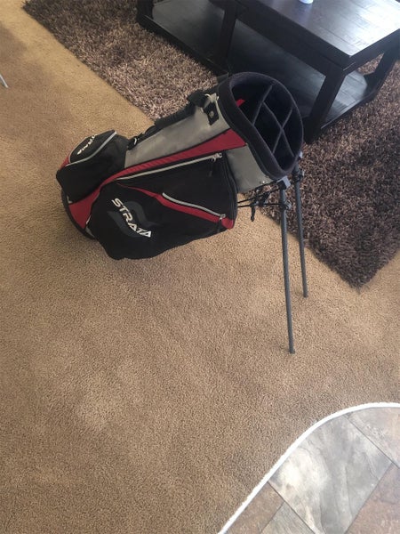 Used golf bag. Functional, in decent shape. Works fine for strapping to a cart and golfing. Has the carry straps. The legs on the stand don’t spread wide enough and when leaned on it will tip over easy. Nice starter golf bag though.