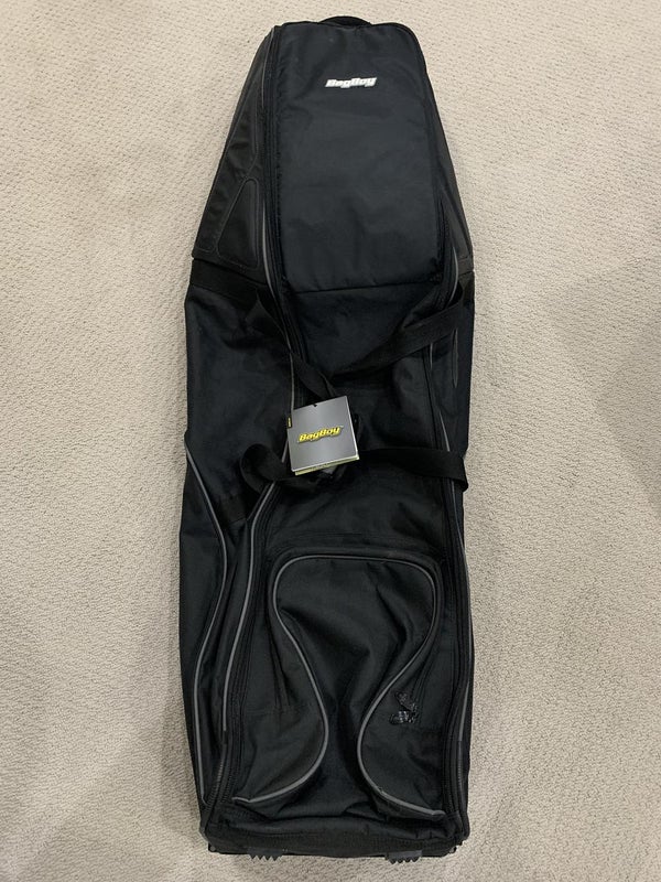 BagBoy Soft Travel golf bag with extra reinforced padding for protecting the clubs. Has wheels, lockable zippers, and big pocket for shoes.